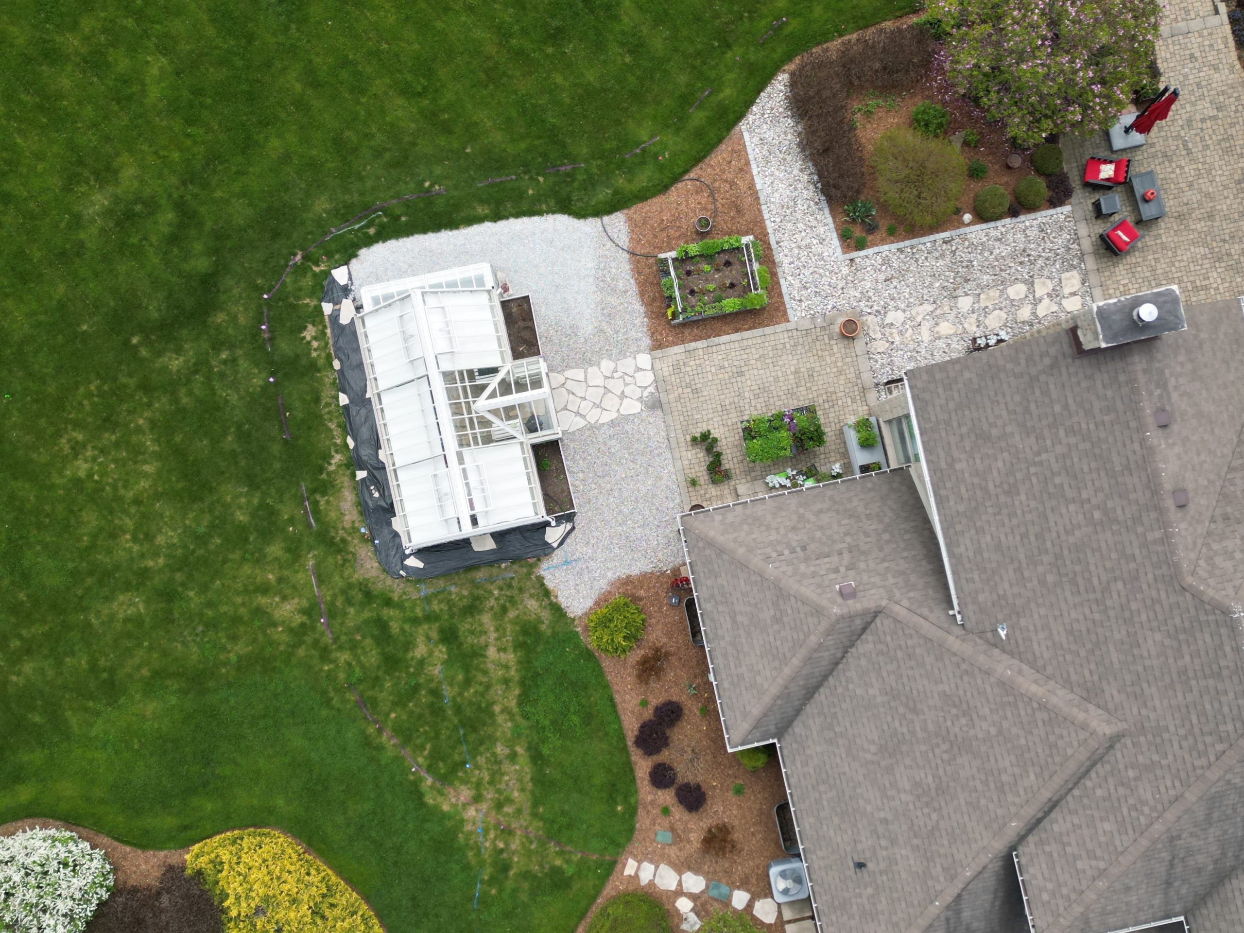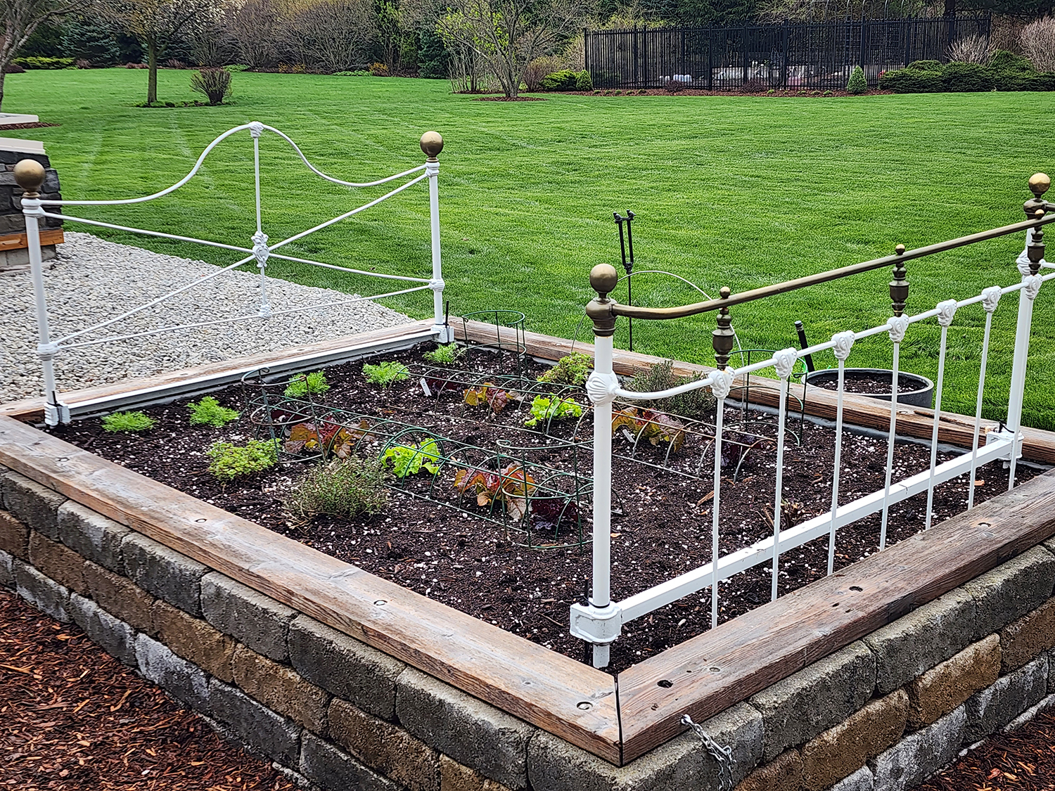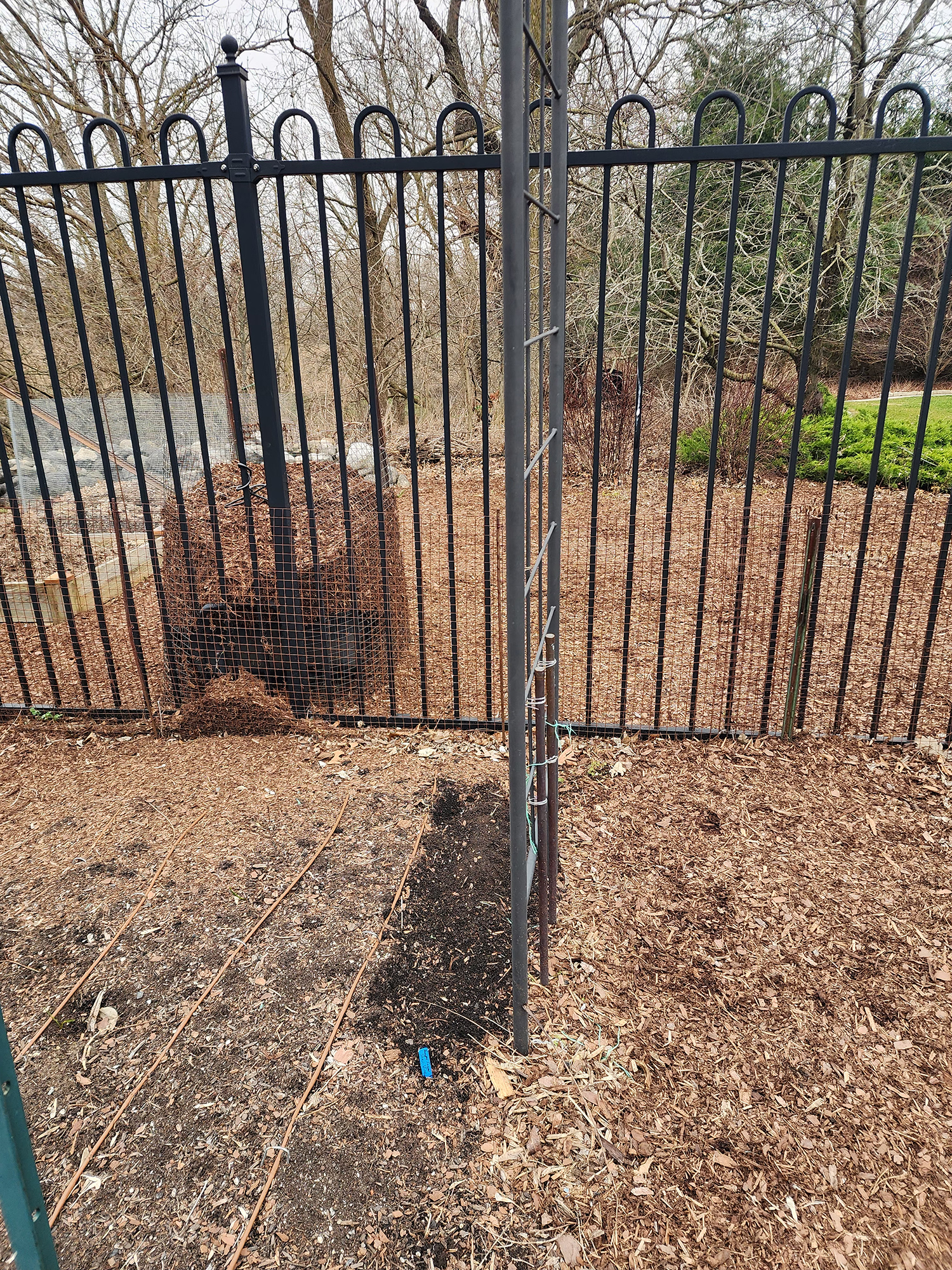 I replace the boxwoods in the square planters outside the greenhouse with 4 large iron obelisks from Wayfair: Ambur Metal Obelisk Trellis in Charcoal (really a light grey)