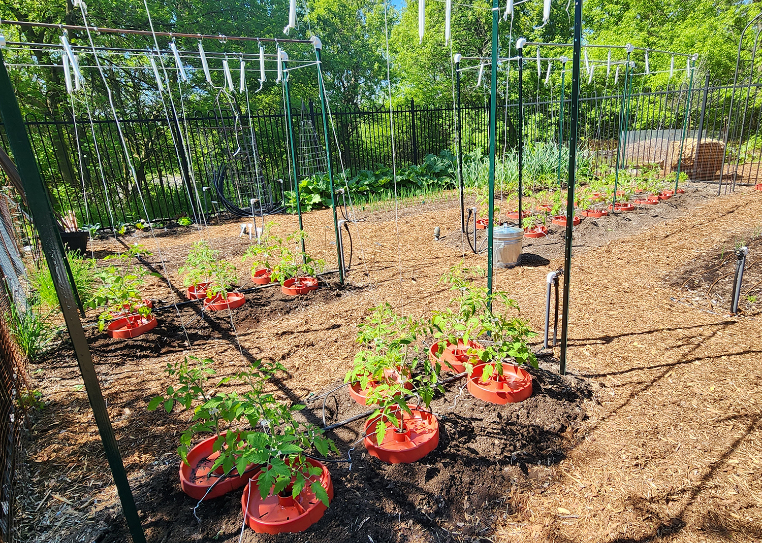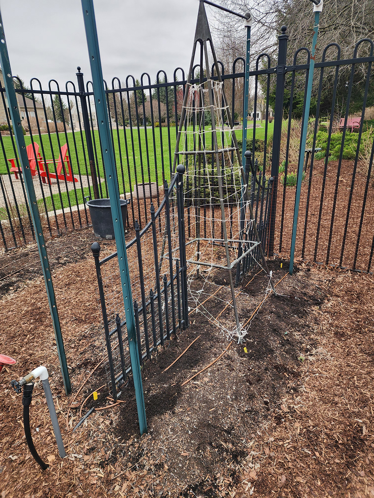 The tomatoes were almost three feet tall, so it was time to tie them to their trellis system. This year, I’m pruning to 2-3 stems each.