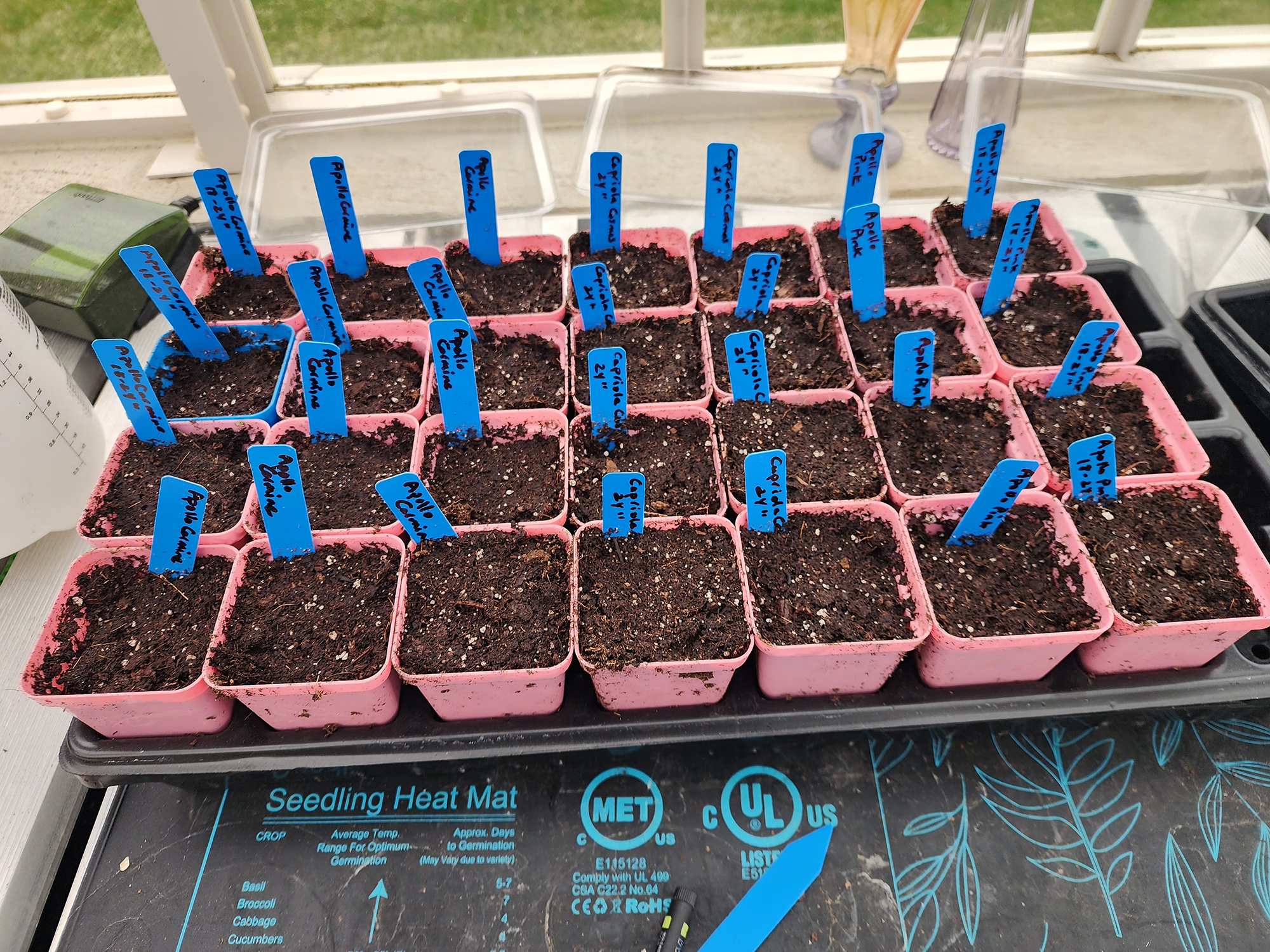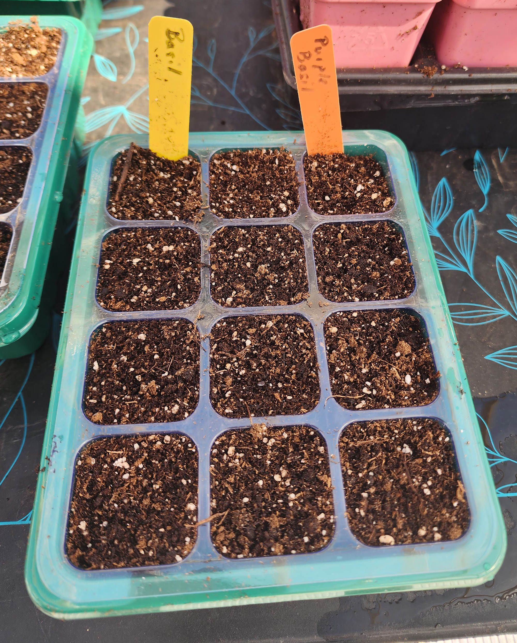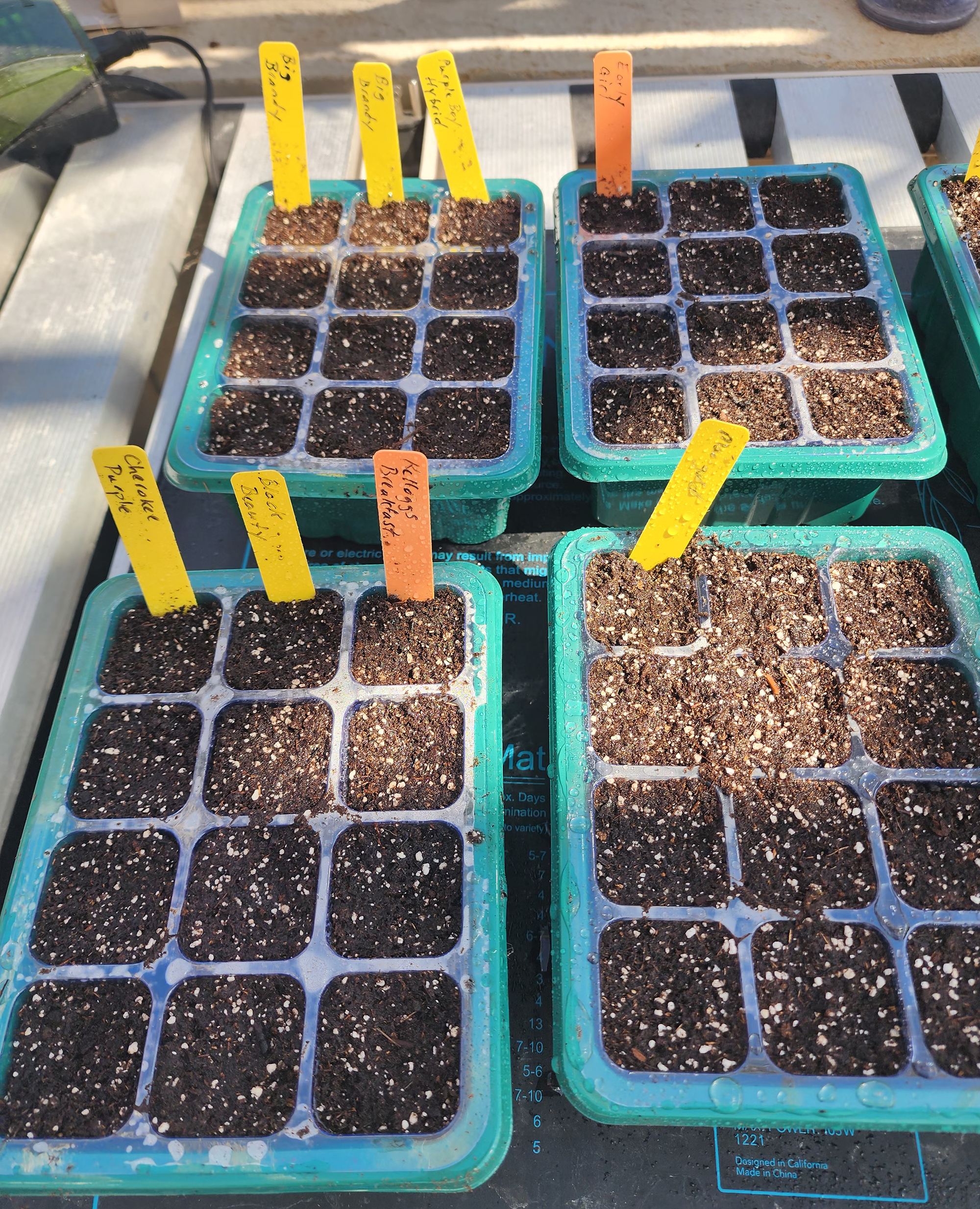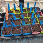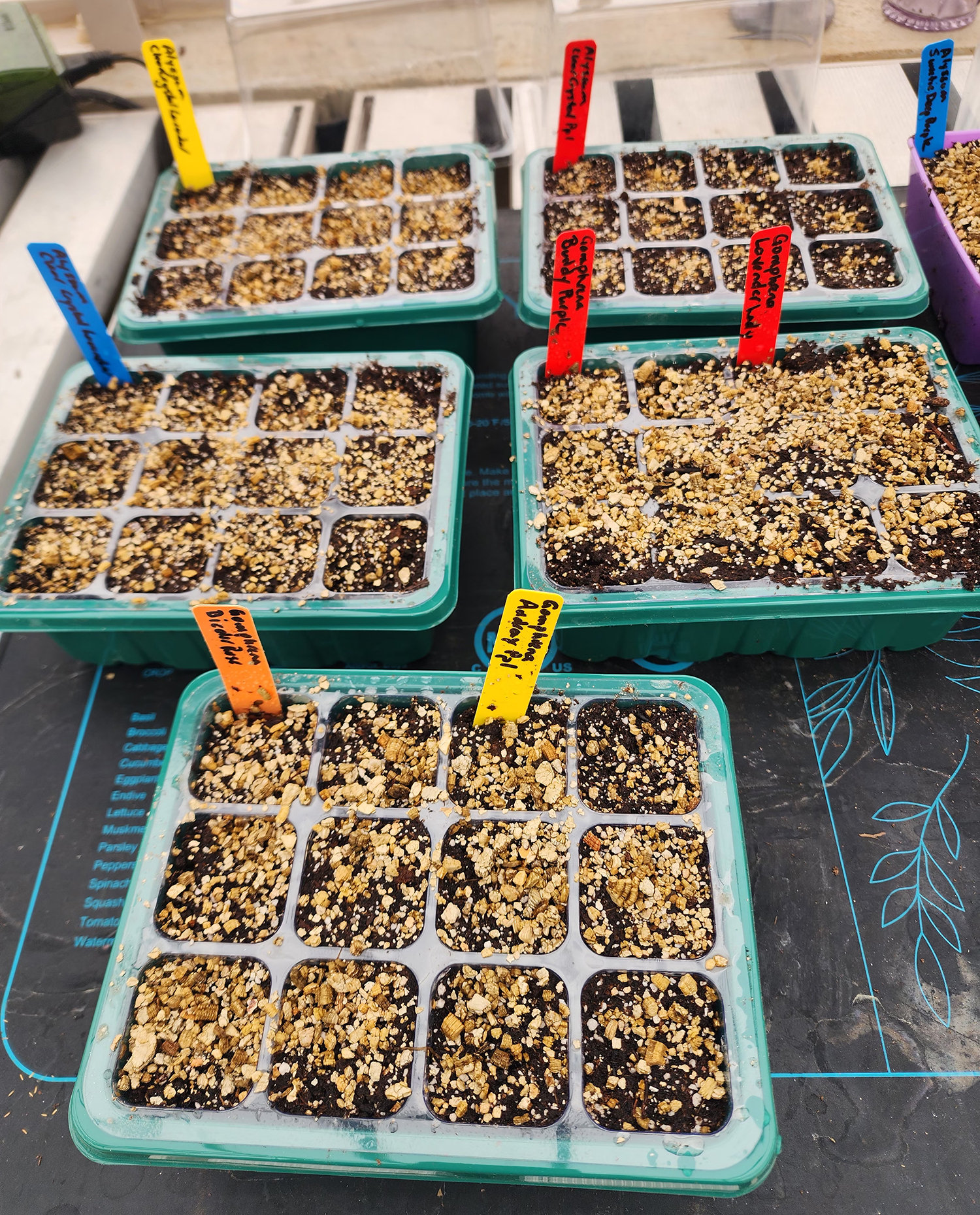 Started a few early flower starts today. Some of these were old seeds, so I sowed heavily and we’ll see what comes up. I have individual humidity domes for these small Boostrap Farmer trays which works well.